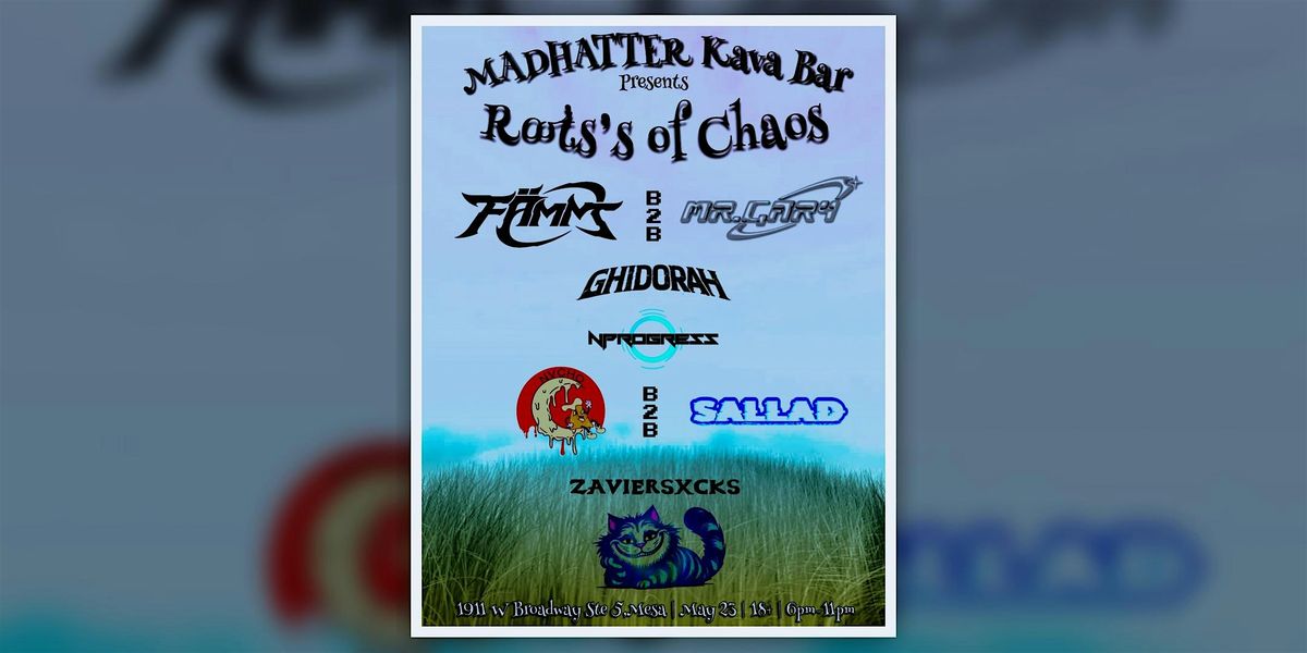 Mad Hatter Kava Bar presents Roots of Chaos — an 18+ night of heavy energy, underground sound, and full-blown chaos. On May 23 from 6PM to 11PM, dive into the madness at 1911 W Broadway Ste. 5, Mesa, AZ, for a stacked lineup: FAMMS, Mr. Gary, Ghidorah, Inprogress, NVCHO, Sallad, and Zaviersxcks. Expect hard-hitting sets, wild vibes, and a crowd ready to lose themselves in the music. This isn’t your average night; it's a full descent into chaos at Mad Hatter. Don’t miss out; grab your friends and join the chaos!