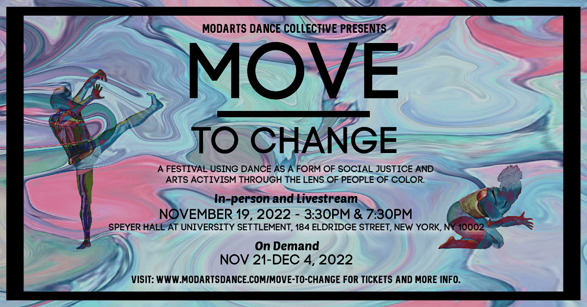 MODArts Dance Collective (MADC) is elated to announce its fifth annual Move to Change Dance Festival on Saturday, November 19, 2022 3:30 PM & 7:30 PM EST at Speyer Hall at University Settlement, 184 Eldridge Street, New York, NY 10002 + Livestream & an On Demand viewing option: November 21-December 4. The purpose of Move to Change is to use dance as a form of social justice and arts activism through the lens of BIPOC choreographers & dance filmmakers. The goal of Move to Change is to create cultural and gender affirming spaces for artists of color (African, Latina/o/x, Asian, Arab, Native American [ALAANA]), MENA, & SWANA to educate, empower, and illuminate the issues that reflect their histories and cultures through their unique and rich movement aesthetics. This year’s themes are Joy embodied in Black & Brown Bodies and Love interpreted through the lens of BIPOC choreographers & dance filmmakers.