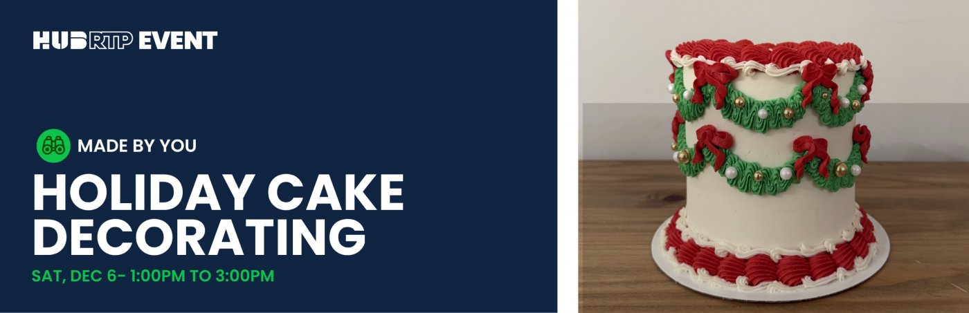 Join Hub RTP for a cozy holiday-inspired cake decorating class led by Morgan Hayes of Morgan Made NC. Whether you’re brand new to cake decorating or looking to sharpen your piping skills this class will guide you through the techniques of vintage cake decorating.