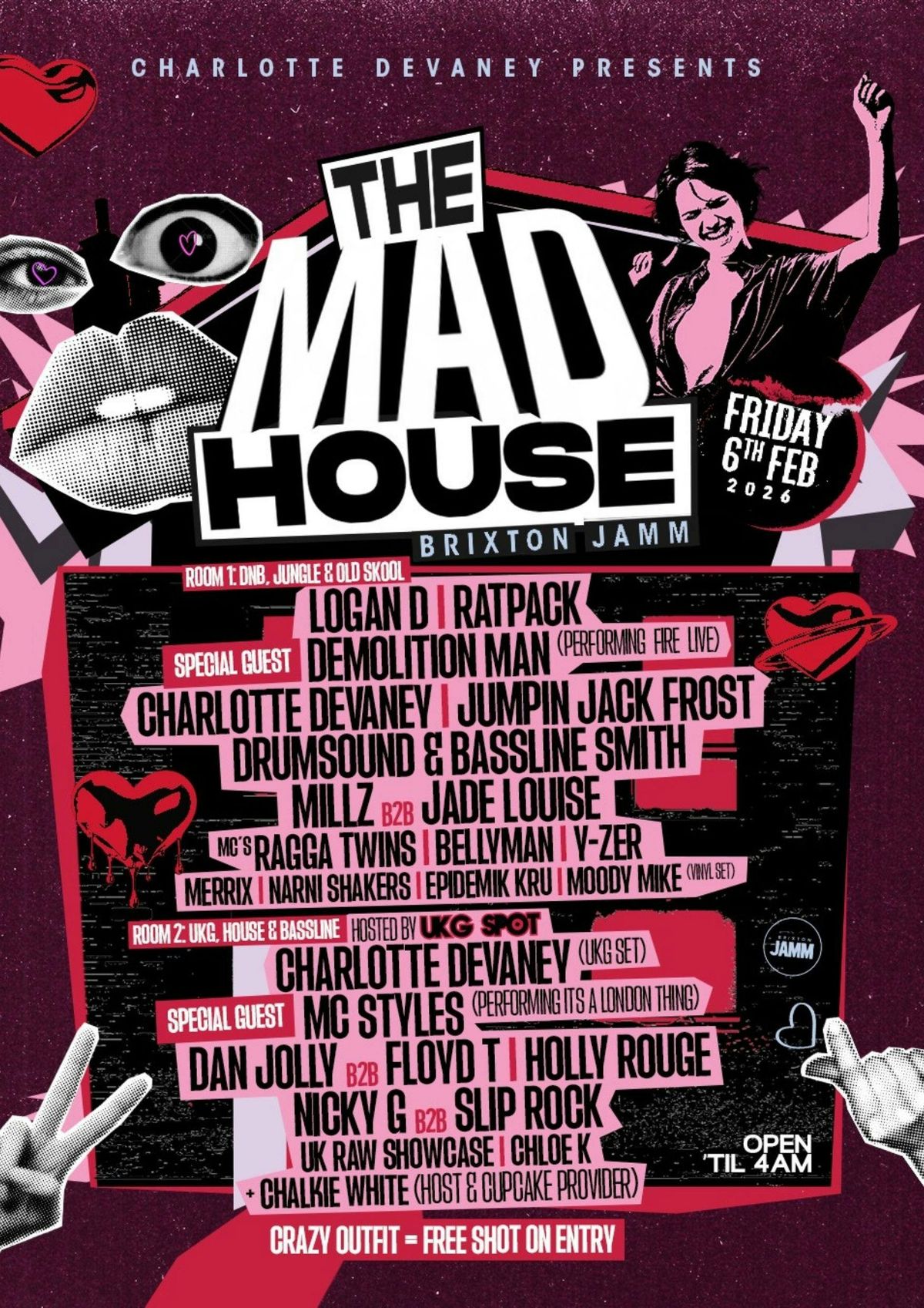 The Mad House returns for the Slightly Early Valentine’s Ball.Forget roses and chocolates, expect bass, chaos, and unapologetic dancefloor energy. A heavyweight lineup featuring Logan D, Ratpack, Demolition Man, Charlotte Devaney, Jumpin Jack Frost and more delivers a night of DNB, jungle and UKG madness. Big love, bigger drops, and a fully inclusive, no-rules rave atmosphere. Cupid’s got nothing on this!Crazy outfit = free shot on entry! 🩷 🏠🤪Disclaimer:
