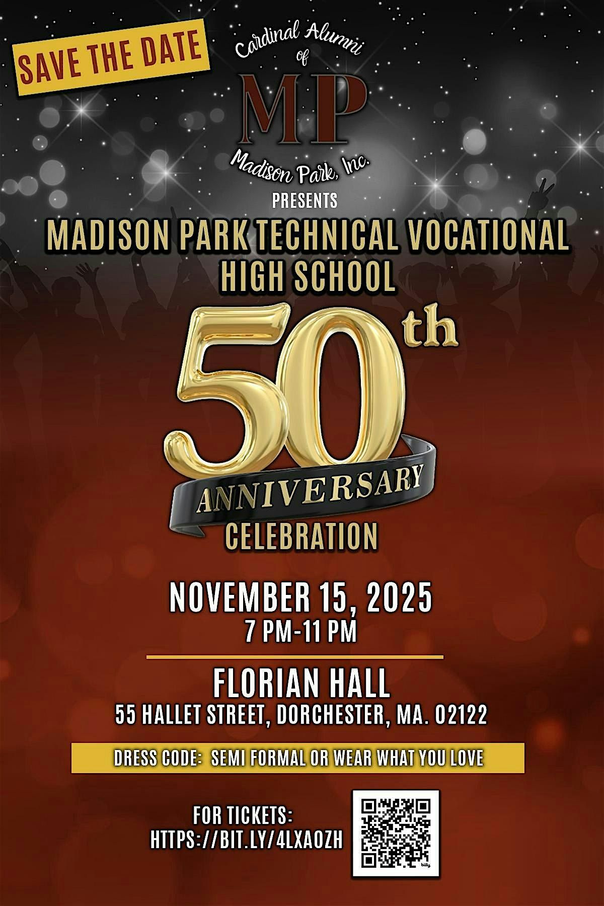 Cardinal Alumni of Madison Park, Inc. invites you to join us at Florian Hall as we commemorate five decades of career and technical education. This in person event is open to the public, including general public, Madison Park Alumni, Madison Park faculty and staff (former and current), community advocates, Massachusetts residents. Mark your calendars for an unforgettable event as we bring people together to acknowledge this milestone time.