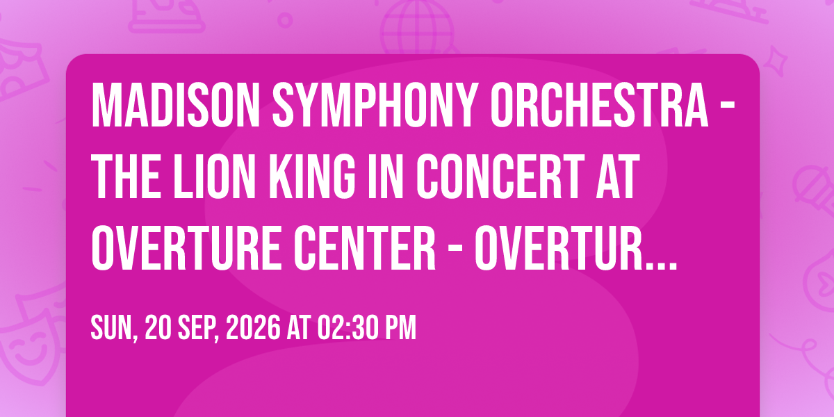 🎉 Prepare to be amazed at Madison Symphony Orchestra - The Lion King in Concert at Overture Center - Overture Hall, the most anticipated gathering of the season! 🌟 Set against the stunning backdrop of Overture Center - Overture Hall in vibrant Madison, WI, this event promises to redefine your expectations. 📅 Mark your calendars for September 20th, 2026 at 02:30 PM and get ready to immerse yourself in an atmosphere of wonder and excitement. ✨ From the moment you arrive, you'll be transported into a world where memories are made and stories come alive. They have crafted an experience that perfectly harmonizes entertainment, innovation, and community spirit. 🌈 Join us as we create moments that will be discussed for years!