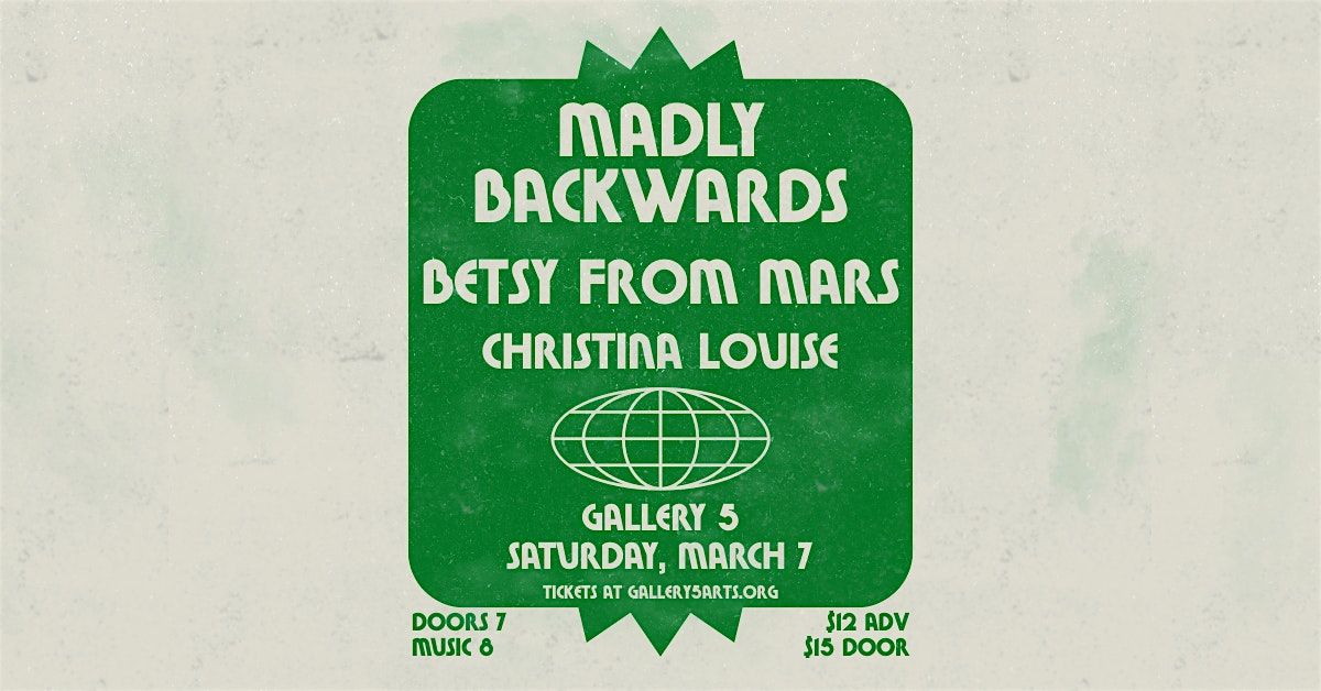 Madly Backwards is a rock band with electric guitars and piano, vocal harmonies, and deep grooves that wrap you in the swagger of a well-worn denim jacket. Betsy From Mars is post apocalyptic space cowgirl music. Christina Louise is soulful singer-songwriter.