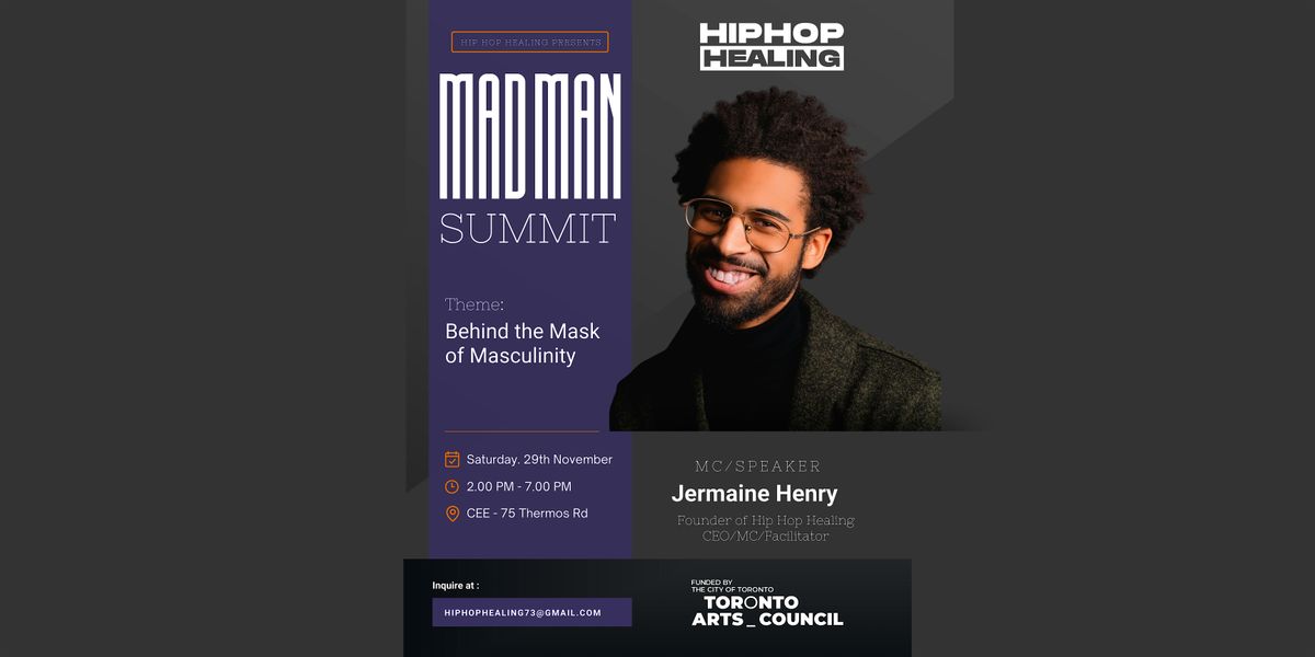 The MADMAN Summit is a transformative initiative rooted in the principles of Hip Hop Healing (HHH), designed to engage Black men in creative expression around mental health, masculinity, and self-identity. This event uses emceeing to dismantle harmful stereotypes of manhood, and fosters resilience, healing, and connection through Hip Hop culture. Featuring panel discussions, skill development sessions, and collaborative expression, this summit takes place November 2025 at the CEE Centre for Young Black Professionals in Scarborough.