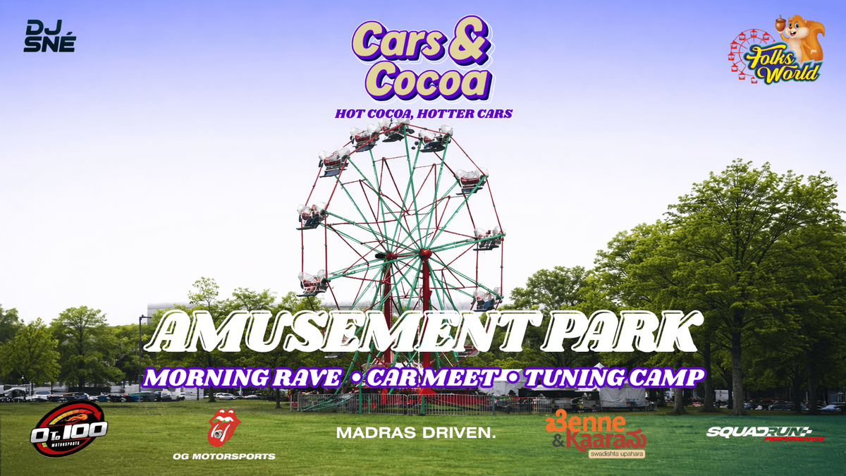 Cars & Cocoa - Amusement Park Morning RaveWake up to the sound of revving engines and thumping beats at Cars & Cocoa – Amusement Park Morning Rave, a first-of-its-kind car meet and rave inside an amusement park.Set in the vibrant atmosphere of Folks World, this unique morning experience brings together cars, music, food, and community like never before. Whether you’re a hardcore petrolhead or just love good vibes, this is the perfect way to kick-start your Sunday morning.🎶 Morning Rave ft. DJ SNEDance it out as DJ SNE takes over with high-energy beats, transforming the amusement park into a sunrise rave zone.🚗 Live Tuning CampGet your car tuned on-site at exclusive discounted prices by professional tuners.🛠️ Auto MarketBrowse and shop from a curated selection of:- Car parts & accessories- Diecast cars for collectors and enthusiasts☕ Complimentary CocoaEvery ticket holder gets a free hot Milo, on us — because great cars deserve great cocoa.🍴 Food & Beverage Partner: Benne and KaaramFuel up with delicious food and beverages throughout the event.This isn’t just a car meet.This isn’t just a rave.This is Cars & Cocoa — where hot cocoa meets hotter cars.