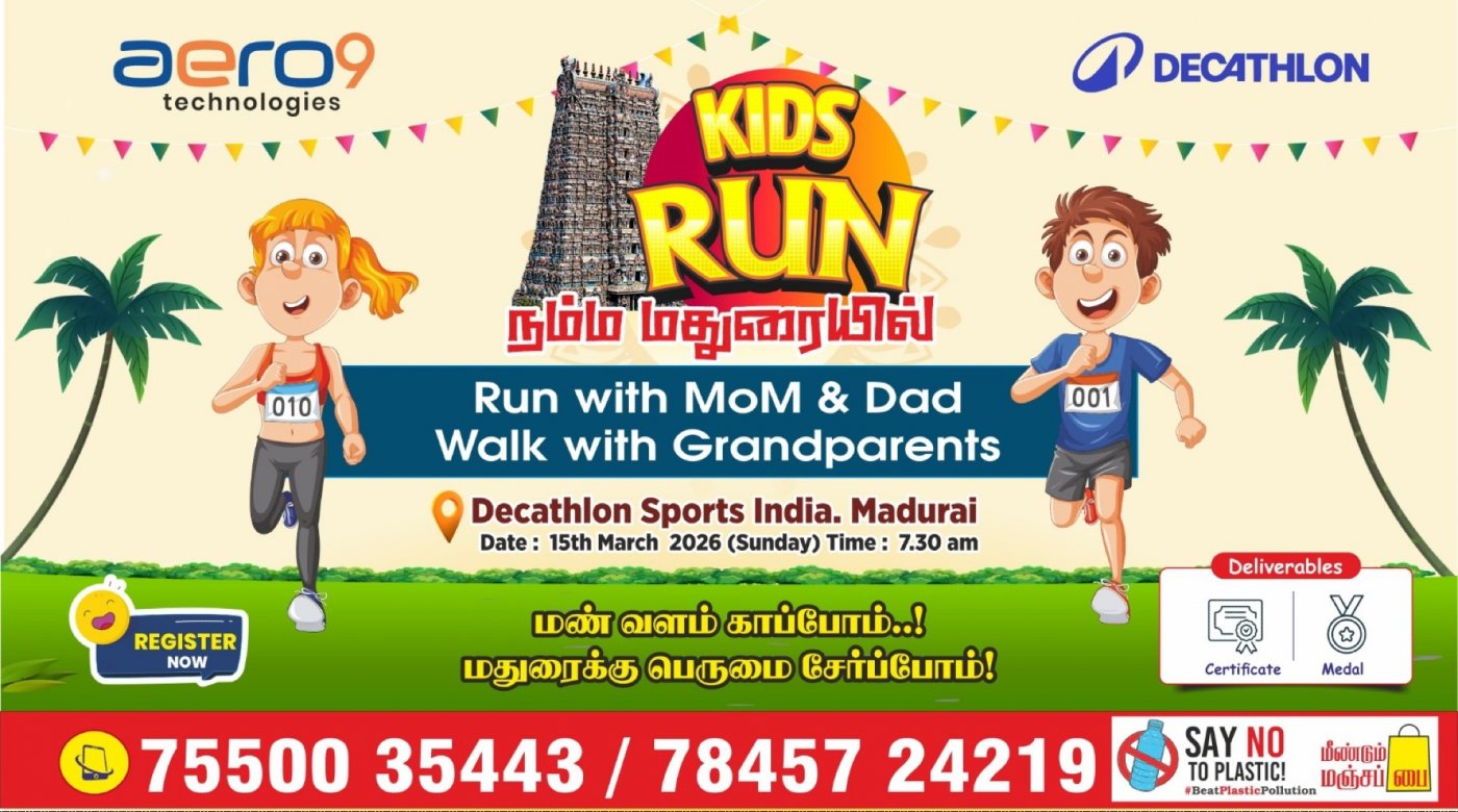Aero9 Technologies Presents “Namma Madurai KIDS RUN" is a Fun Run for kids along with parents is a first of its kind and was conducted successfully in various cities by Aero8 Technologies. The main goal is to create awareness about "No plastic clean and green environment." But that is not the only motivation though. But also to set up our little striders up for long term health and fitness success.