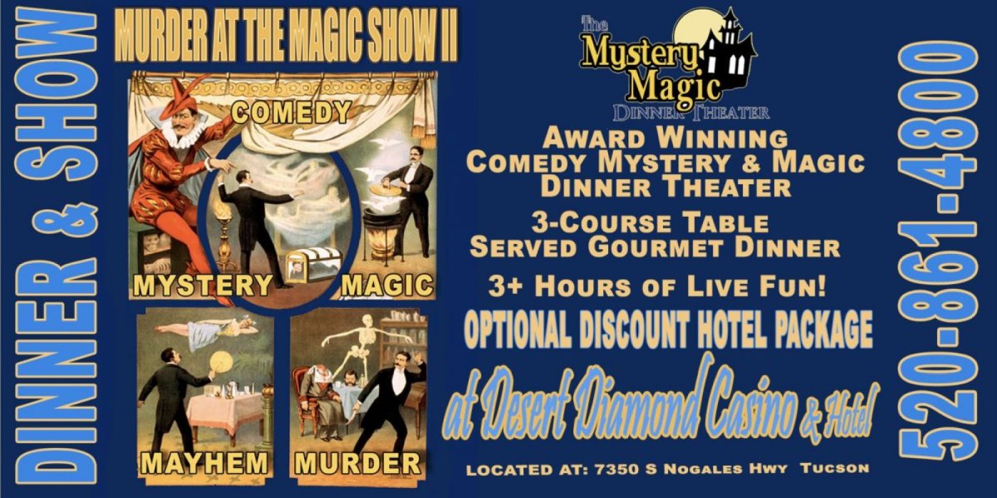 This Valentine's Day at Desert Diamond Casino in Tucson an unforgettable evening of delicious dining and entertainment awaits you, presented by the acclaimed Mystery & Magic Dinner Theater. Guests will be treated not only to a delicious, table-served 3-course dinner, but also a live theatrical experience combining comedy, mystery and magic.