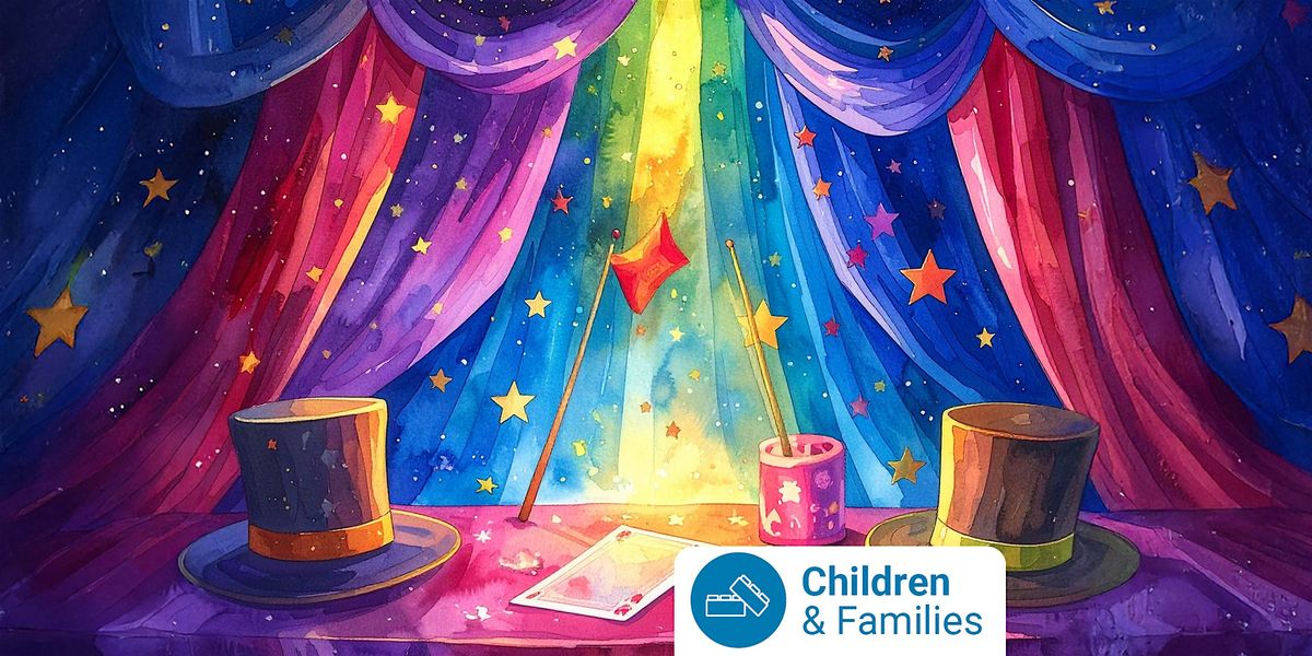 [Image Description: A colourful illustration of magic top hats and wands sitting on a table inside a circus tent. Text reads Children and Families. ]