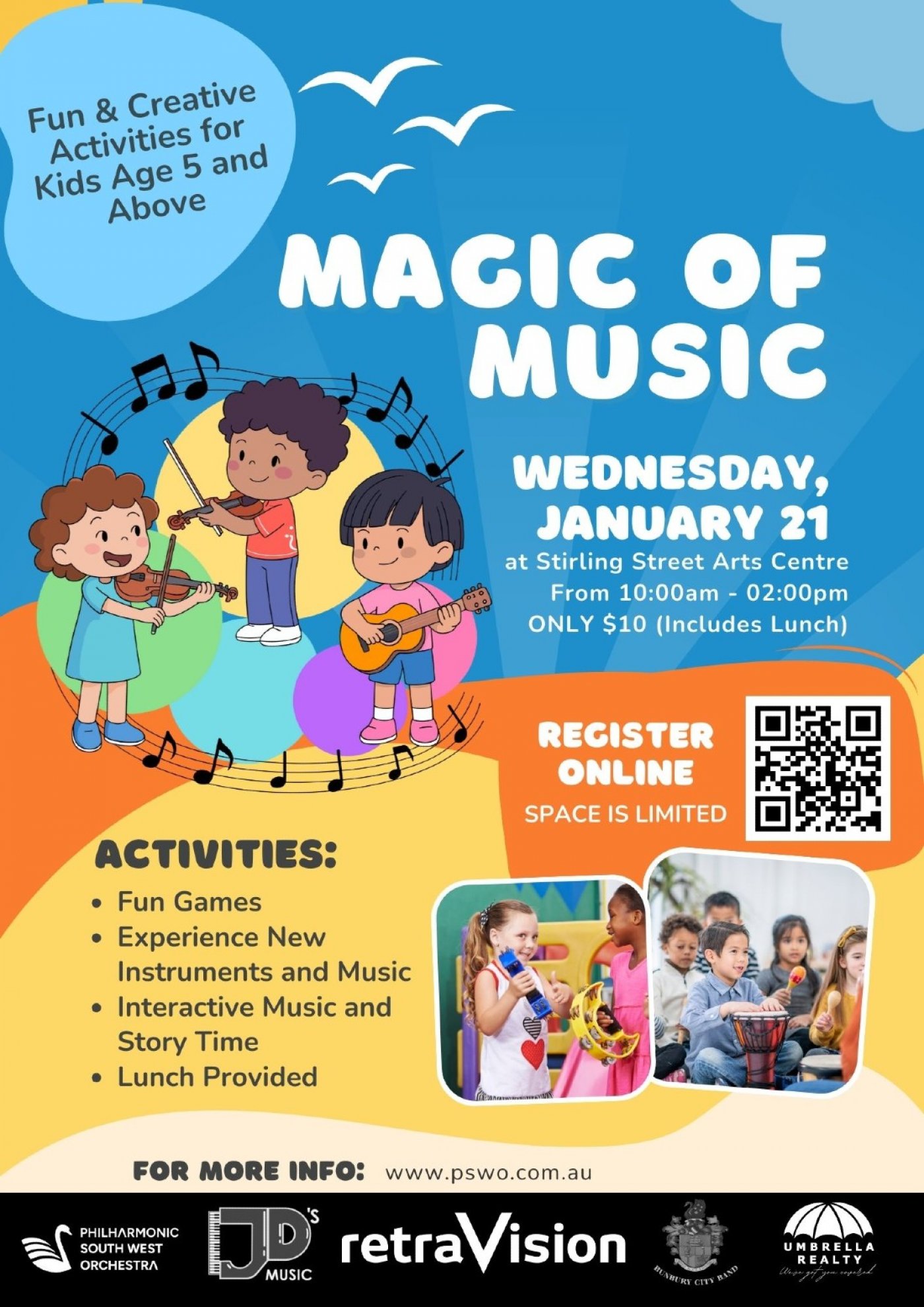 Join members of the Philharmonic SouthWest Orchestra and friends for a day of interactive music and storytelling, fun games, hands on experience with new instruments and music and lunch course!