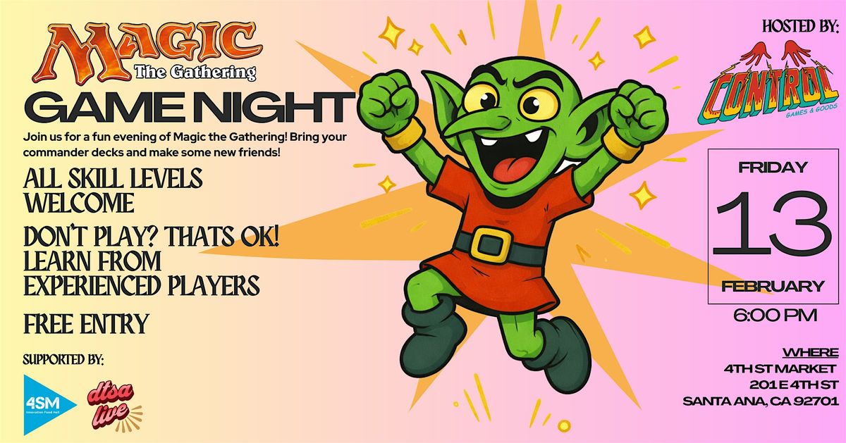 Join us for a fun and welcoming evening of Magic: The Gathering at 4th Street Market, a vibrant food hall located in the heart of Downtown Santa Ana. Grab dinner, drinks, and dessert from the many vendors inside before settling in for an exciting night of gameplay and community.