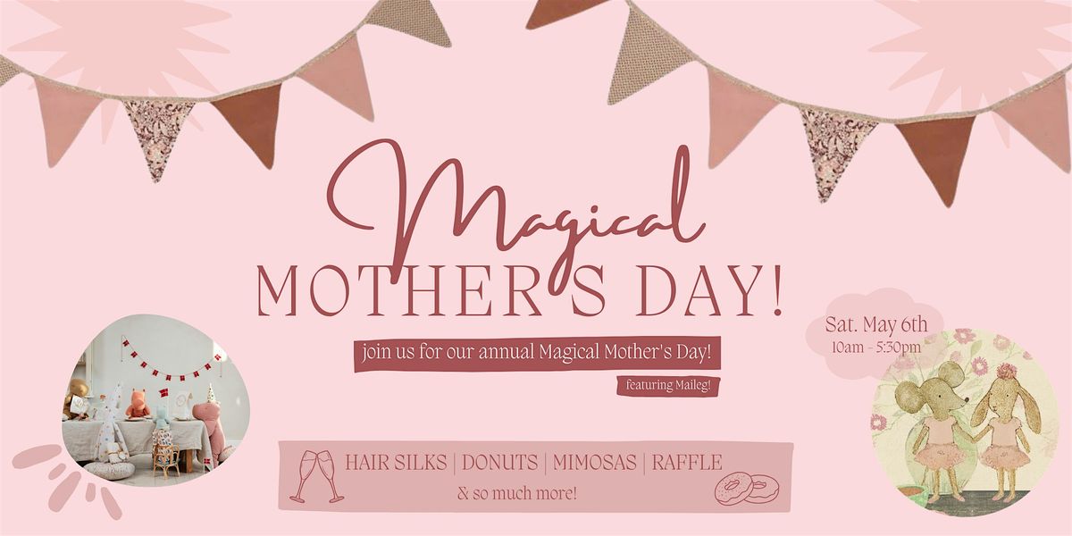 Join us at Magical Child on May 3, 2026 at 10:00 AM for our annual Mother's Day celebration. It's the perfect chance to make some magical memories with your little ones! Win prizes from the prize wheel and in our raffle, enjoy complimentary treats and drinks, and add a little magic to your look with hair silks and permanent jewelry pop-ups! We can't wait to see you there!