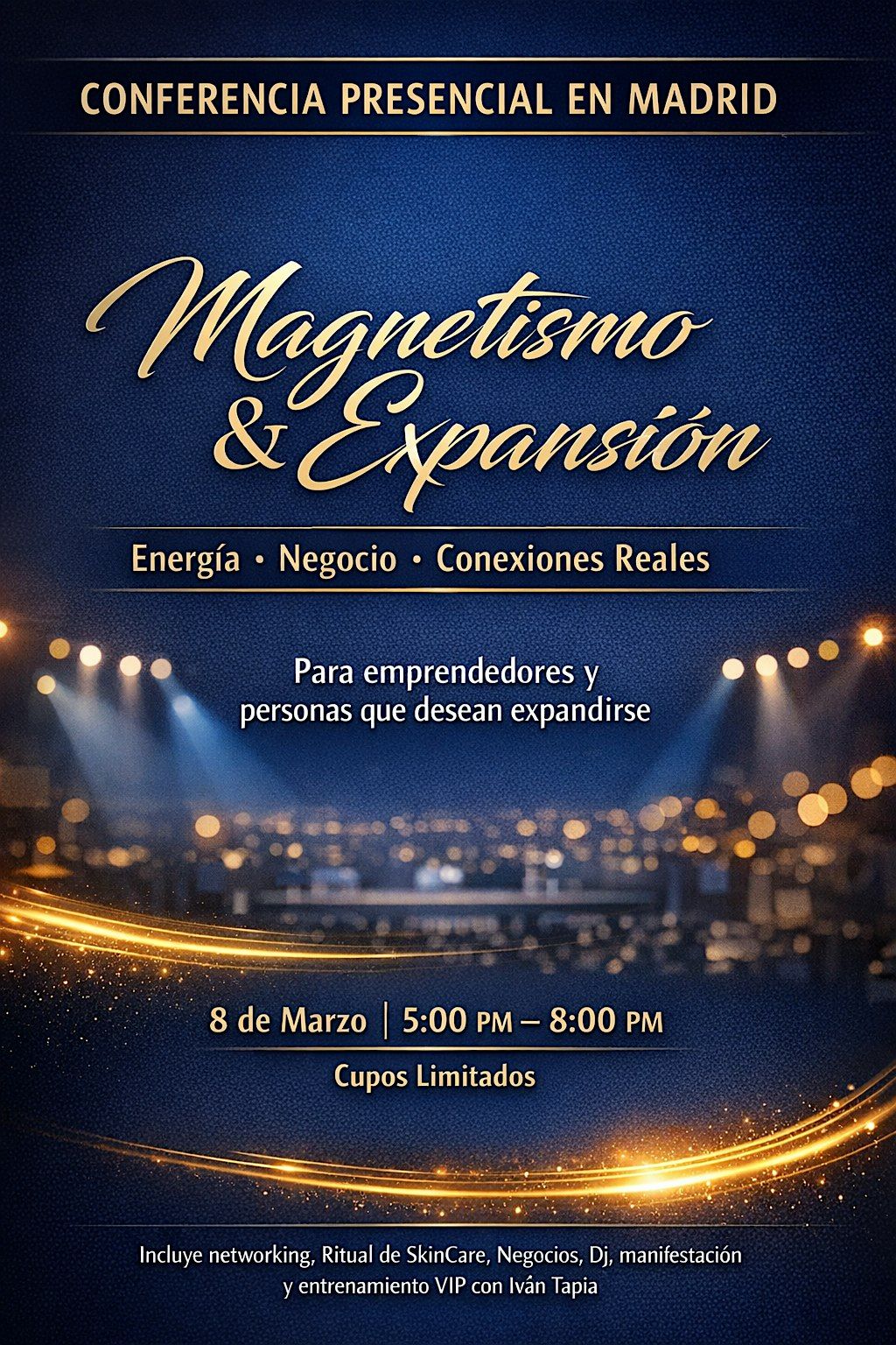 Magnetismo & Expansión es una conferencia presencial en Madrid diseñada para emprendedores y personas que desean crecer personal y profesionalmente. Una experiencia que combina energía, visión empresarial y conexiones reales, incluyendo networking, experiencia de skincare, música consciente y entrenamiento VIP con Iván Tapia. Una tarde para expandir tu mentalidad y tu círculo.