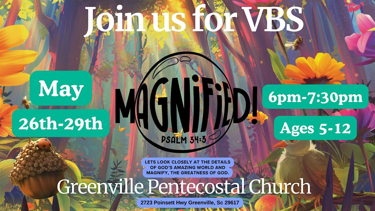You are invited to Magnified VBS! Join us for a week of fun, games, and learning about the Bible. Our Vacation Bible School event will be held at Greenville Pentecostal Church, where kids can make new friends and grow in their faith. Don't miss out on this exciting opportunity to magnify God in the smallest of things. Food will be provided during rotations