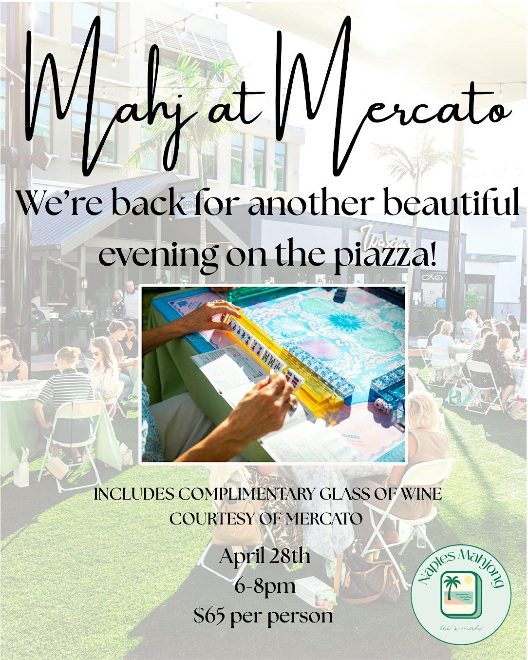 Join us for a fun evening on the Piazza—mahj under the lights, soak in the beautiful Naples weather, and enjoy a complimentary glass of wine courtesy of Mercato. A portion of all ticket sales will be donated to a local charity. We cannot wait to mahj with you!