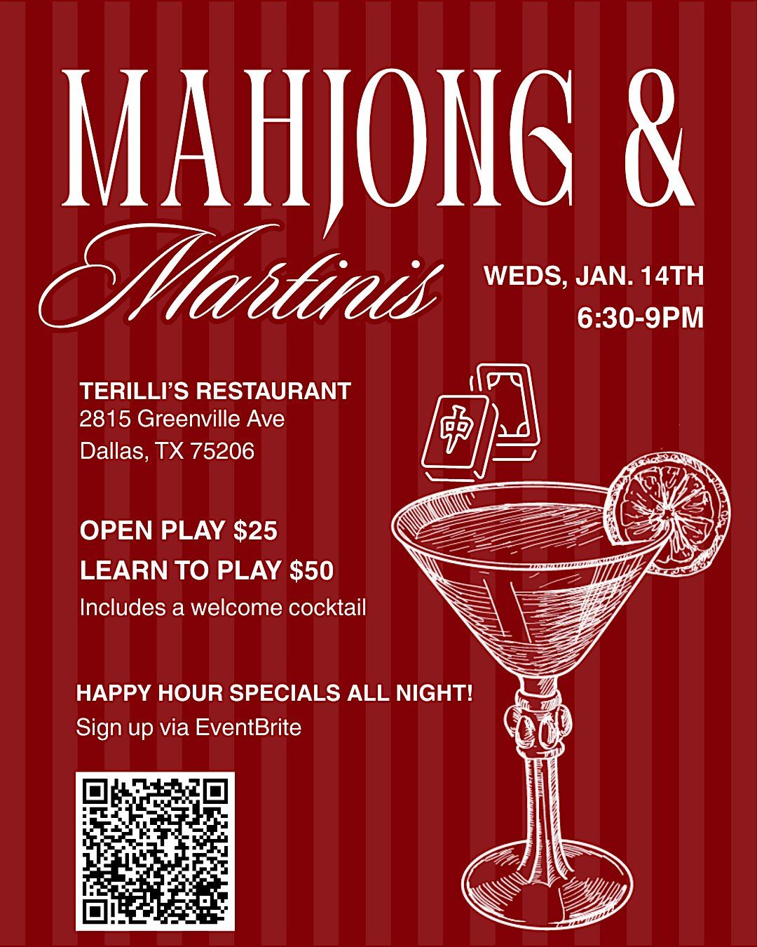 Join us for Mahjong & Martinis at Terilli's! Ticket includes a welcome cocktail.