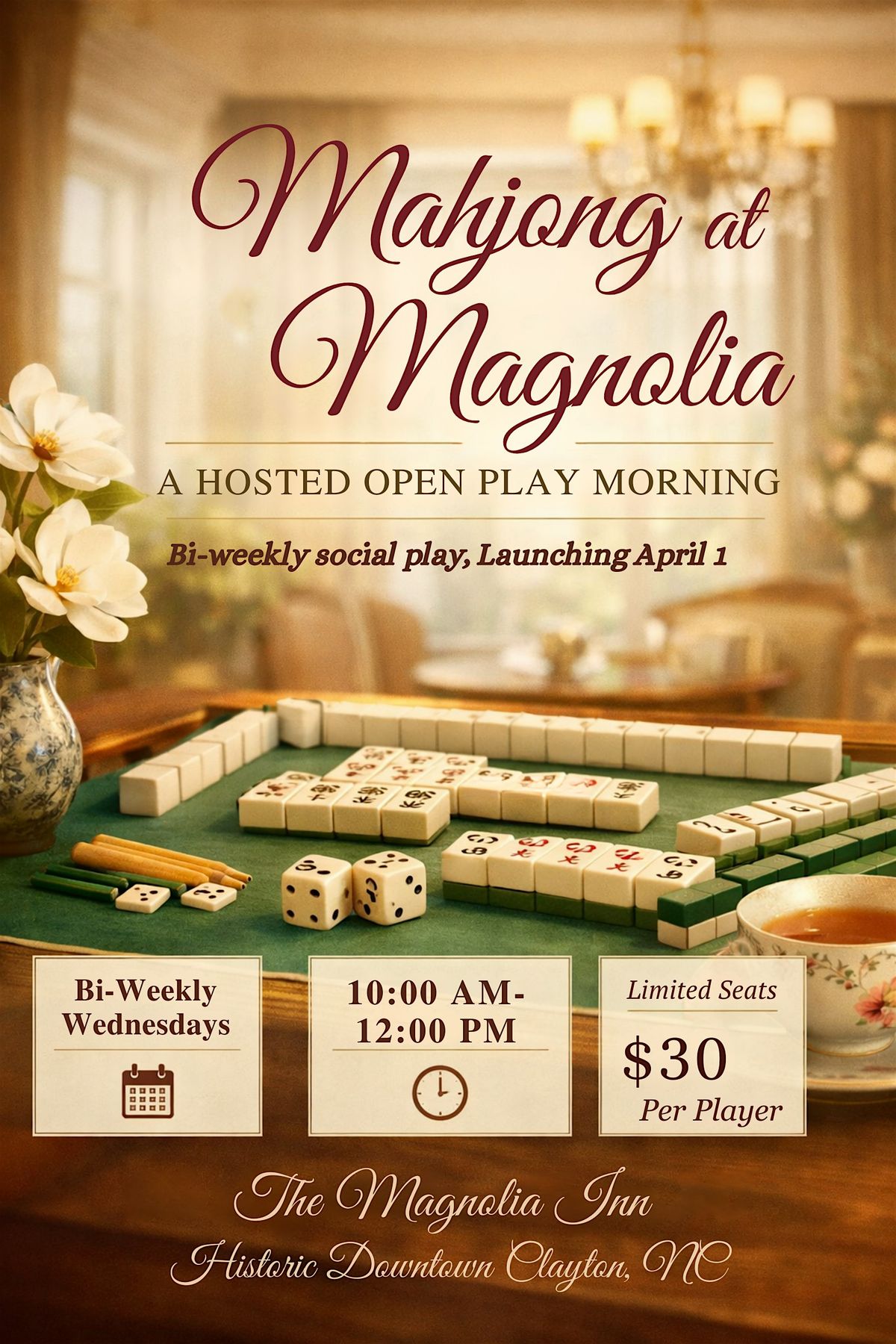 Join us for Mahjong at Magnolia, a welcoming and social American Mahjong open play gathering hosted at The Magnolia Inn in historic downtown Clayton.