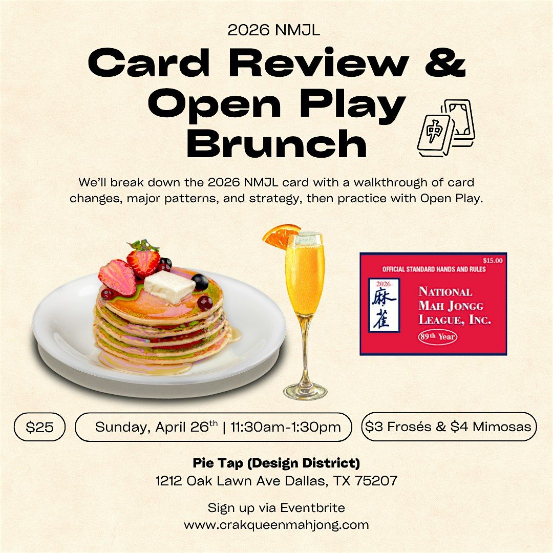 We’ll break down the 2026 NMJL card with a walkthrough of card changes, major patterns, and strategy, then practice with Open Play. You must already know how to play mahjong. Tiles are provided, just bring your 2026 NMJL card. Limited cards will be available for purchase for $15.