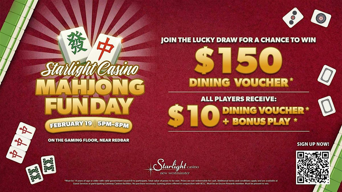 Join us for an exciting Mahjong Funday at Starlight Casino New Westminster! Whether you're a seasoned player or simply love the game, this event is a great chance to enjoy friendly play and the chance to win some great prizes!