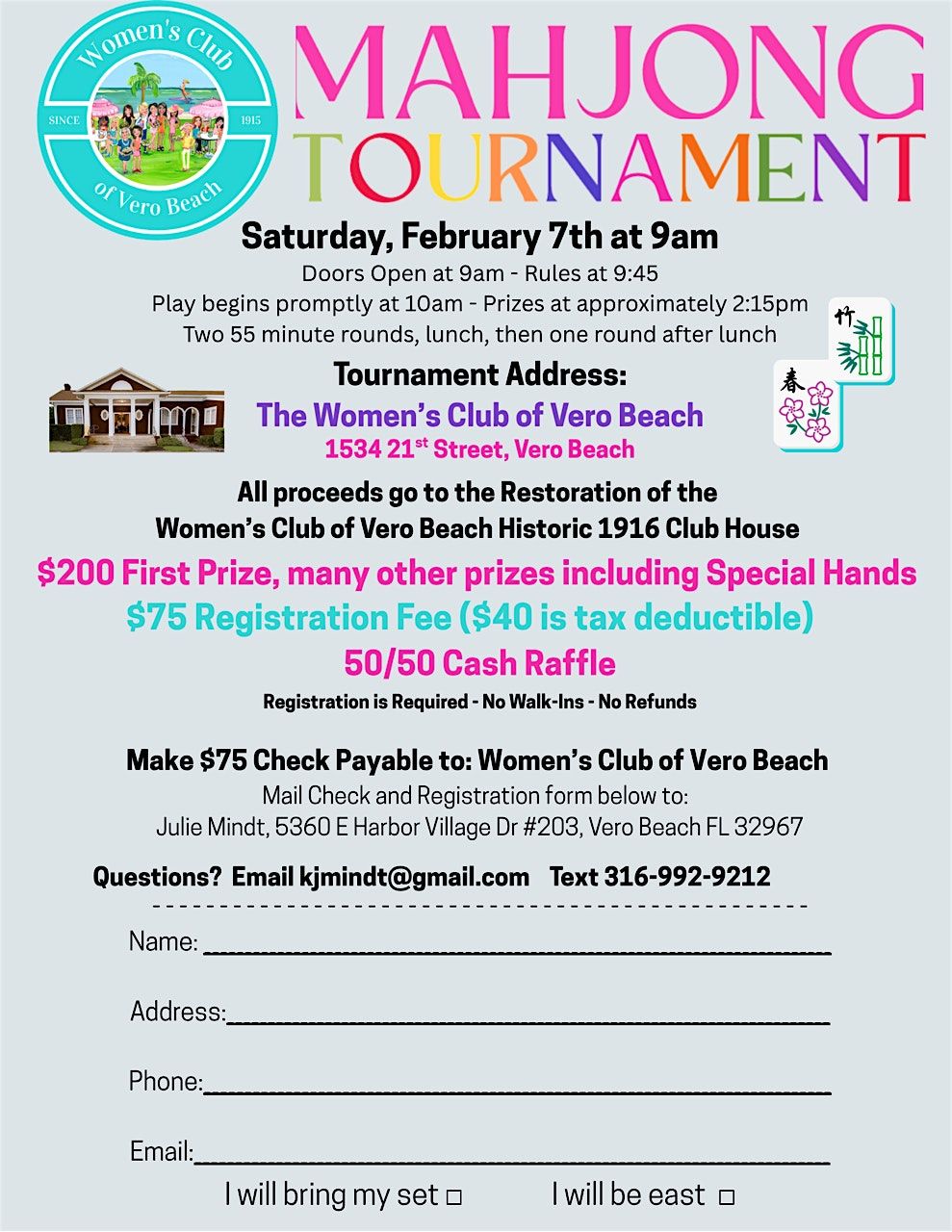 Join us in person for an exciting day of tiles, strategy, and fun at the Women's Club of Vero Beach MAHJONG TOURNAMENT. Meet new friends and show off your skills. Don’t miss this chance to enjoy great vibes and awesome games face-to-face! For quick an easy ticket purchases, sign up and buy your tickets on line. Be sure to text Julie Mindt @ 316-992-9212 after your purchase to answer a couple of questions.