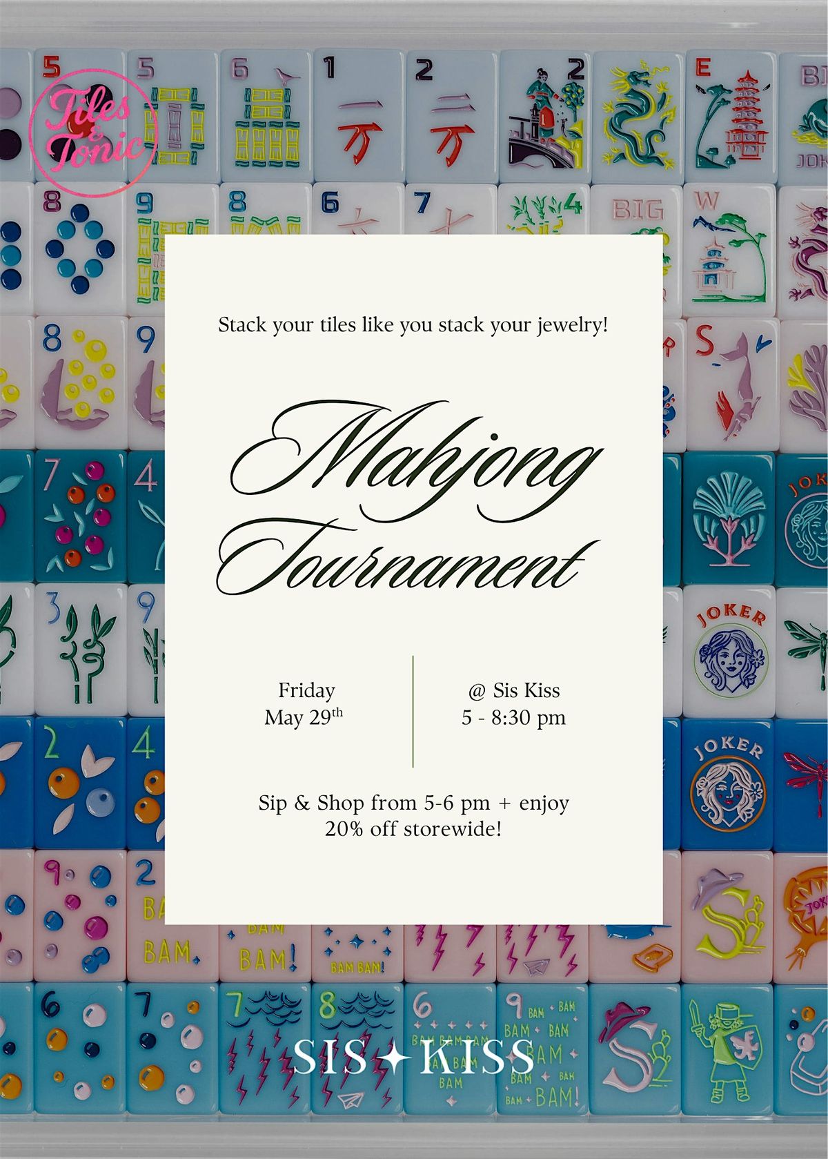 Ready to show off your Mahjong skills? Join us in person at The Sis Kiss for a fun-packed tournament! Whether you're a pro or just here to have a blast, this event is perfect for anyone who loves a good challenge and great company. This is a friendly tournament - all levels welcome if you have had at least one lesson. Don't miss out on the laughs, the strategy, and the ultimate Mahjong vibes! Lots of prizes to be won! Sis Kiss gift-cards for the top winners, and a raffle of mahjong tiles, mat and racks. A raffle ticket, drinks and snacks are included. Trust us - you don't want to miss this!