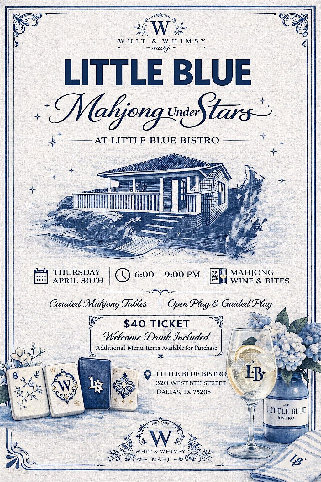 Join us for an intimate evening of mahjong beneath the stars at Little Blue Bistro in Bishop Arts.
