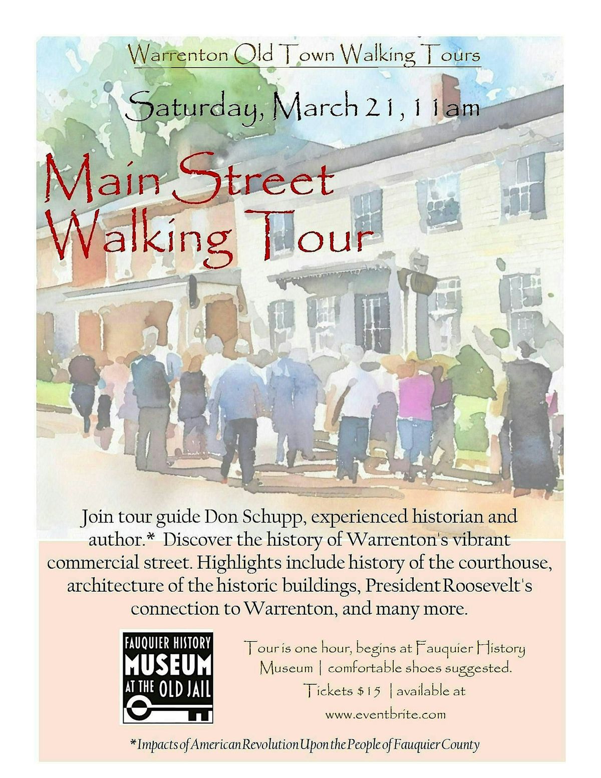 Walk the streets of Old Town Warrenton with an experienced guide. Experienced tour guide and author, Don Schupp, will lead this tourAbout this Event