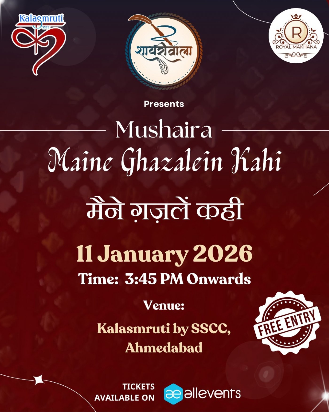 “Maine Ghazalein Kahi” is a soulful poetry evening curated by Shaayariwaala, where words meet emotion. This beautiful night will bring together renowned poets from Ahmedabad, who will enchant the gathering with their ghazals and nazms, filling the mehfil with the true colors of shayari.