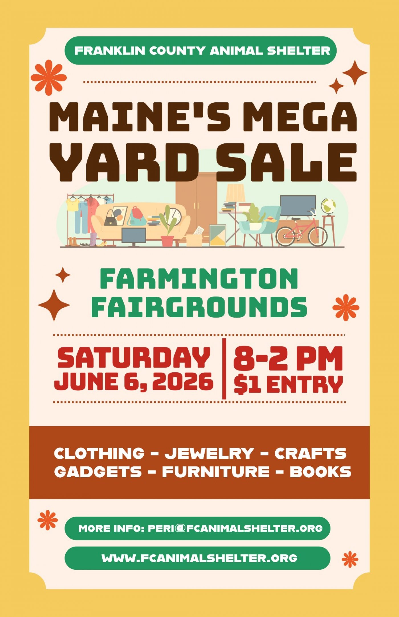 Franklin County Animal Shelter is holding our annual Maine's Mega Yard Sale on June 6, 2026 at the Farmington Fairgrounds! This event is our biggest fundraiser, and there were over 100 vendors last year, with thousands of attendants looking for deals.