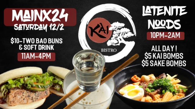 Kai Bistro will be hosting TWO events for MainX24 this year. From 11am-4pm we will be outside serving our Thai style Bao Buns where you can get 2 buns + a drink for $10! Then for the late night crowd, from 10pm-2am we’ll be cooking up some Korean Street Ramen with all the delicious toppings. PLUS come in to the bar and get $5 sake or soju bombs all day long!! Also open for regular dine in service from 11am-10:30pm.