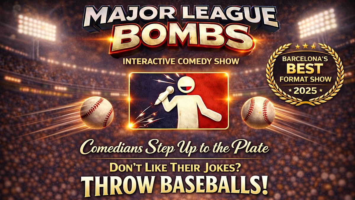 Major League Bombs is interactive comedy with a curveball! 8 Comedians step up to the plate to make you laugh, but if their jokes don’t land, you get to throw baseballs. If enough baseballs are thrown the comedian is elimnated before there time is up! Will they hit a home run or run home? The crowd decides! Voted Barcelona's best format show in 2025 for a reason - come see why!