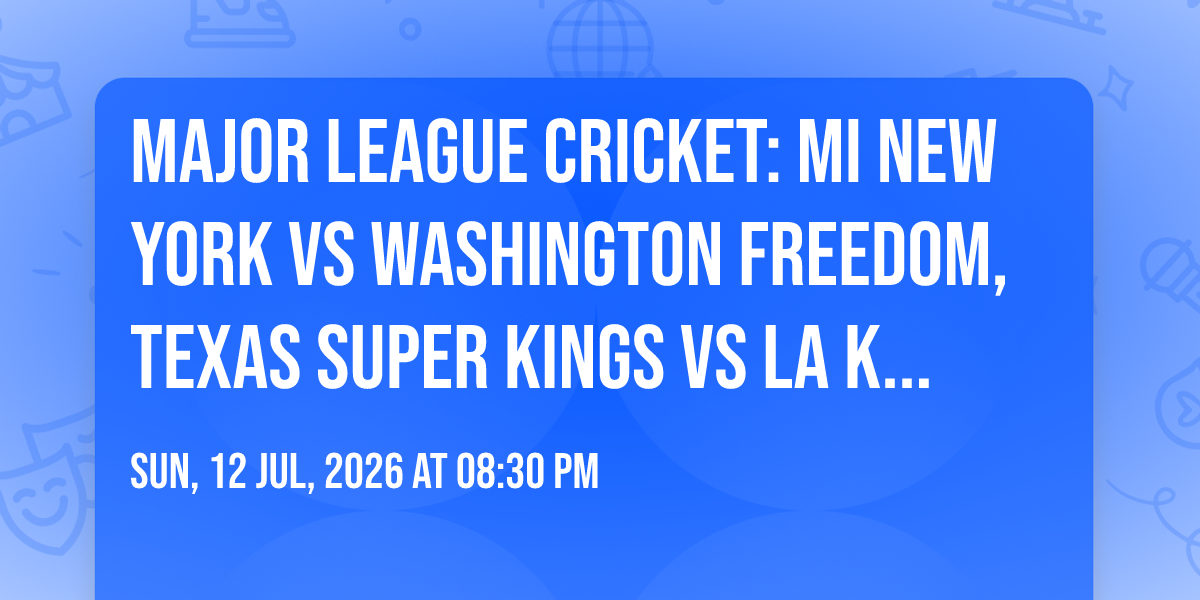 📍 Location: 32.7682, -96.987✨ Discover the extraordinary at Major League Cricket: MI New York vs Washington Freedom, Texas Super Kings vs LA Knight Riders, where magic meets reality in ways you've never imagined! 🏛️ Set in Grand Prairie Stadium nestled in bustling Grand Prairie, TX, this event promises to be a landmark occasion. 📅 Taking place on July 12th, 2026 at 08:30 PM, it's going to create an atmosphere where every moment becomes a cherished memory. 🌟 Immerse yourself in an experience crafted with attention to every detail, designed to surprise and delight at every turn. They have worked tirelessly to ensure this event exceeds all expectations, bringing together elements of entertainment, innovation, and pure joy. 🎊 Don't miss your chance to be part of this remarkable journey!