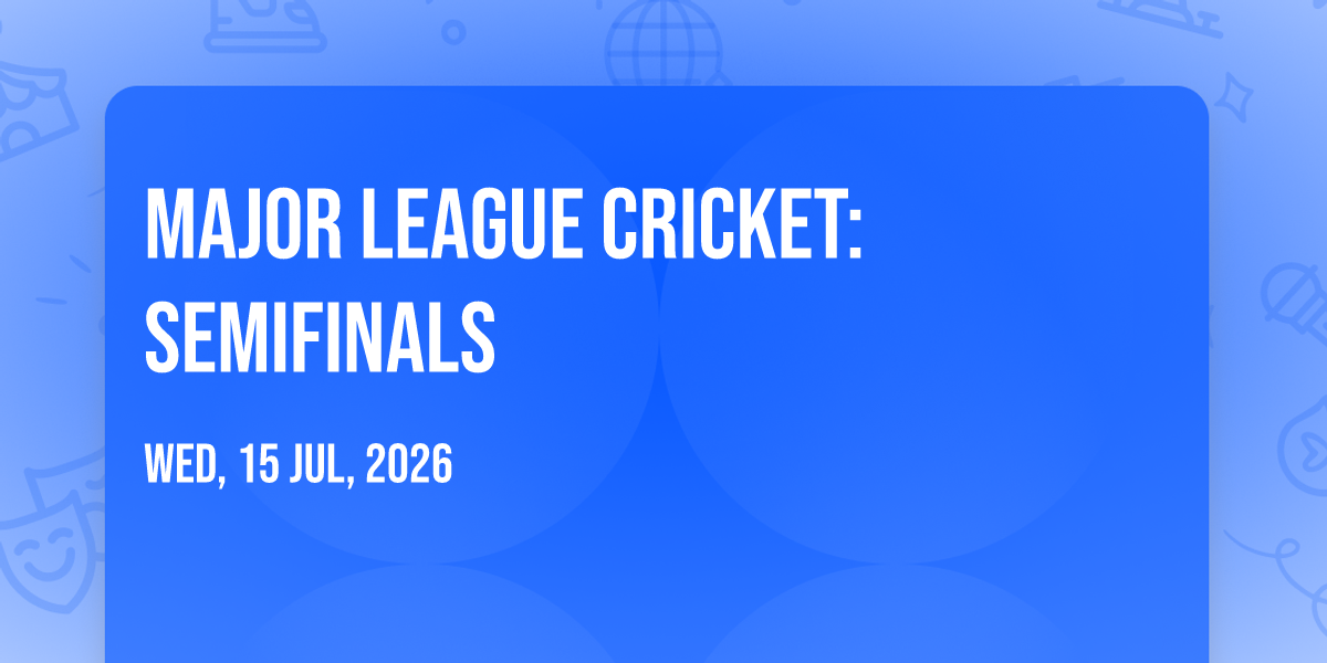 📍 Location: 37.7514, -122.201✨ Enter a world of endless possibilities at Major League Cricket: Semifinals, where every moment tells a story! 🏛️ The stunning Oakland Coliseum in vibrant Oakland, CA transforms into a realm of wonder on July 17th, 2026 at 01:30 AM. 🌟 They have crafted an experience that goes beyond the ordinary, combining elements of surprise, delight, and pure entertainment. Every detail has been thoughtfully considered to ensure your journey with us is nothing short of extraordinary. 🎯 Join fellow adventure seekers and memory makers in this celebration of imagination and innovation. 🎊 Reserve your spot today and be part of something truly special!