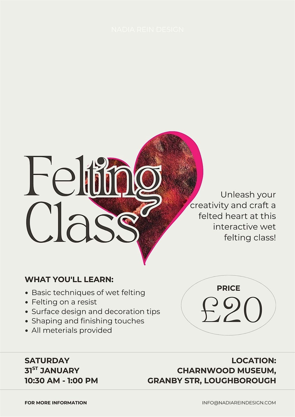 You’ll leave with a finished felted heart and the confidence to continue experimenting at home.