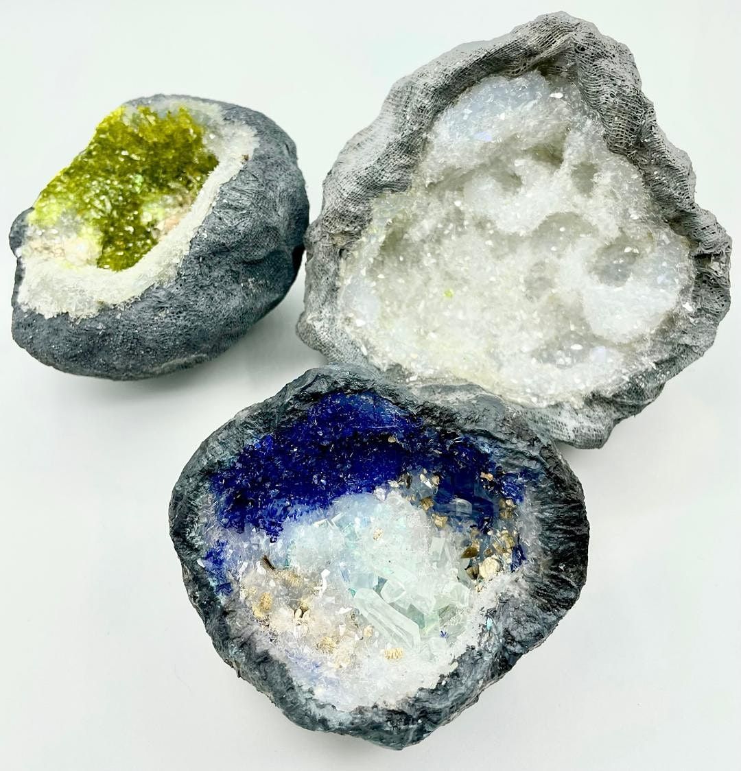 Geodes and druzy stones are fascinating with their tiny glittering crystals and subtle color changes. Jeanne Sanders is an artist in house at MC2 who has been using offbeat materials in her artwork for years. She has pioneered new ways of creating with plastics that mimic the look of glass, and now she's figured out a way to mimic the look of natural, crusty crystalline surfaces.