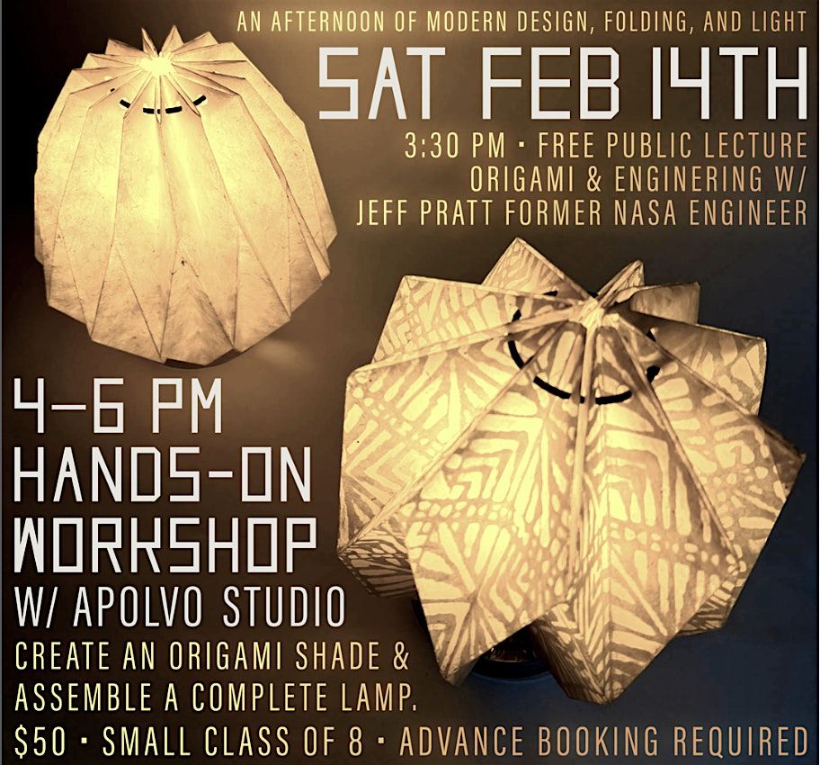Get ready to fold and create your very own modern origami lamp in a fun, hands-on workshop! Join us in person at Materias Primas for a creative experience where you'll learn cool folding techniques and craft a stylish lamp that's perfect for your space. No experience needed – just bring your enthusiasm and leave with a one-of-a-kind light fixture you made yourself! Introduction by Jeff Pratt, former NASA engineer!!