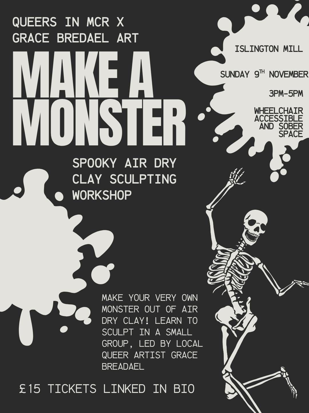 Join Queers In MCR for a spooky air dry clay workshop led by local artist Grace Bredael. Learn how to sculpt air dry clay in a small group at this 2 hour workshop, and make your very own monster to take home with you!