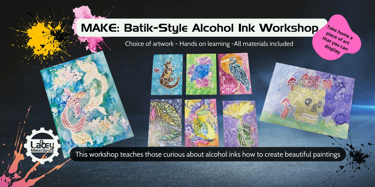 Discover the magic of batik-inspired alcohol ink painting in this guided, two-hour creative workshop at Lacey Makerspace! You’ll learn how to use vibrant alcohol inks combined with a wax-resist technique to create striking, colorful artwork that radiates with life.