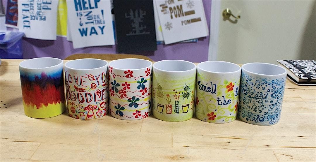 Create custom-made tote bags, key chains, coffee mugs, notebooks, t-shirts, and buttons as you experiment with a variety of decoration methods to embellish gift items with your own pen and ink sketches, pre-printed artwork, dye-cut shapes, and watercolor sublimation painting. Artists welcomed, as well as folks who prefer to work from stencils, pre-printed artwork, dye-cut shapes, and rubber stamps. There is something for every skill level. Beginners welcome!