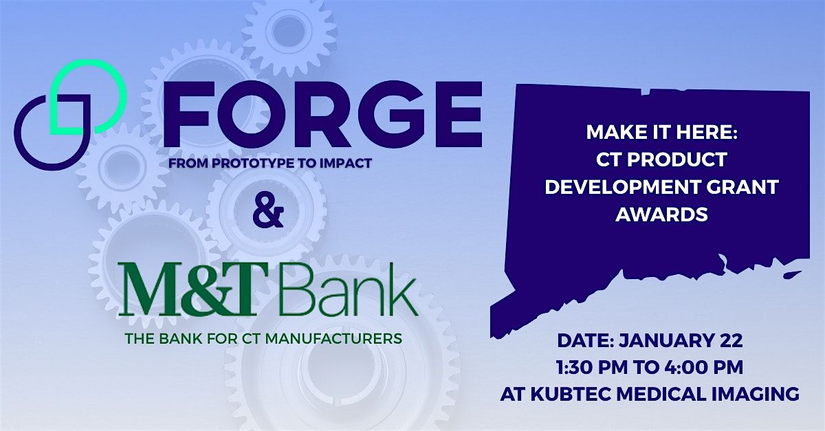 Join FORGE and M&T Bank for a special in-person celebration of innovative manufacturing in Connecticut. Together, we will announce the newest recipients of the Connecticut Product Development Grants and highlight how these awards support emerging hardtech startups working with in-state manufacturers to scale production of innovative products.