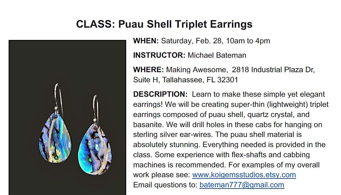 Learn to make these simple yet elegant earrings! We will be creating super-thin (lightweight) triplet earrings composed of puau shell, quartz crystal, and basanite. We will drill holes in these cabs for hanging on sterling silver ear-wires. The puau shell material is absolutely stunning. Everything needed is provided in the class. Some experience with flex-shafts and cabbing machines is recommended. For examples of my overall work please see: www.koigemsstudios.etsy.com