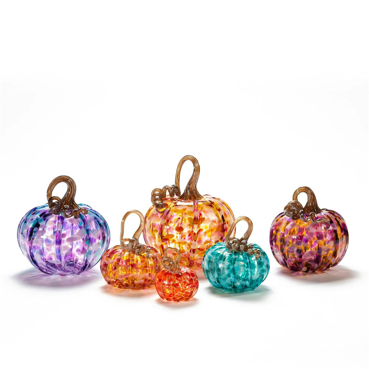 In this workshop you will work one on one with a Ballis Glass instructor in a group setting. The size of the pumpkin is roughly 4inches in diameter. Good for ages 8+. At first you will choose your favorite colors and design. Then the piece starts off with a little bit of clear glass and a bubble, then more glass and color, blowing into a mold, and finishing it off with a glass stem. Each workshop seats 8 people. Each pumpkin must cool over night and be picked up the following day. Shipping is available.