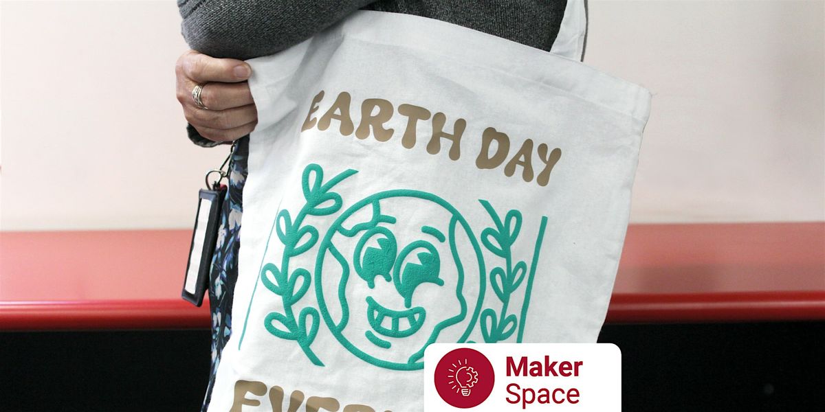 [ Image description: person with a heatpress design on a tote bag over their shoulder. Design says Earth Day with a picture of a planet smiling with leafs surrounding it. Text reads Maker Space]