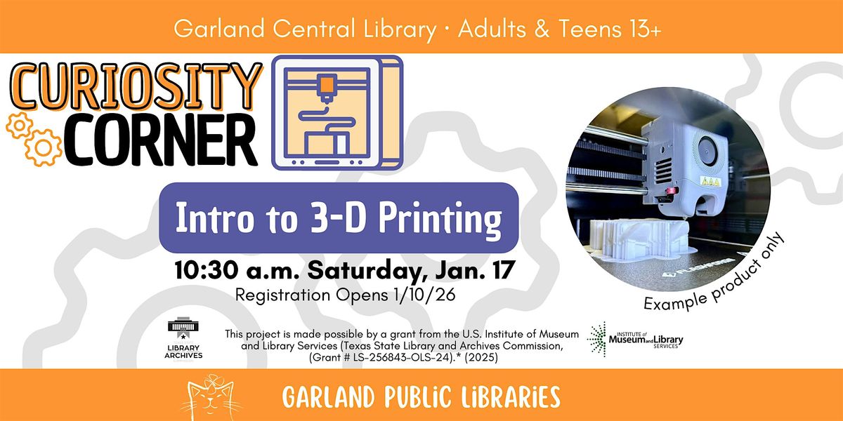 Learn the basics of 3D Printing in this intro makerspace class. This training class will set patrons up to use the 3D Printers during any Open Lab at the library! Open to adults and teens ages 13 and up. Registration is required.