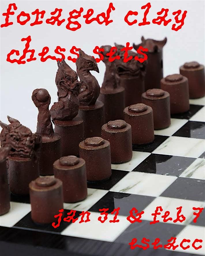 Over two weeks, we will create a checkerboard with slip techniques (paper resist/scraffito), and create chess pieces using simple sculpting methods. All of the 'colour' used to differentiate the black/white will be made using slip made from foraged clay/