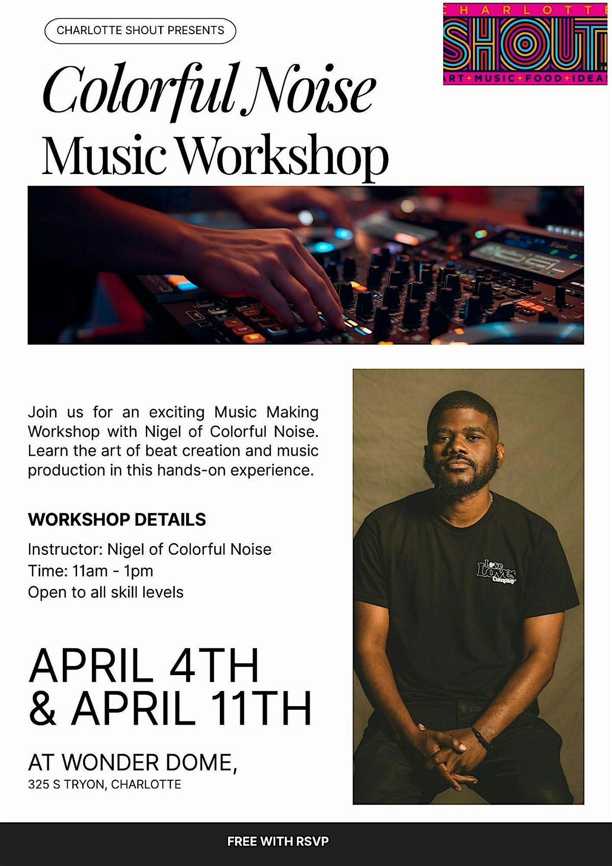 Join Nigel Malone, professional producer and engineer, for a free hands-on audio engineering and music production masterclass presented by Colorful Noise. This workshop is open to all levels, giving producers an in-depth look at the creative and technical process behind professional sound. Participants will learn the fundamentals of audio engineering and mixing, explore industry-standard tools and software, and discover techniques for sampling, arranging, and beat production. It’s a chance to refine your sound, build your skills, and connect with other local artists and producers in a collaborative, creative environment