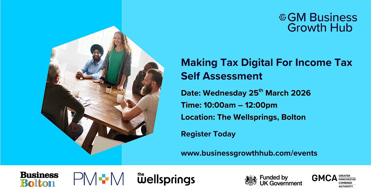 GM Business Growth Hub, Bolton Council’s Business Bolton, The Wellsprings and PM+M invite you to an important session exploring the latest updates from HMRC on Making Tax Digital for Income Tax Self Assessment (MTD for ITSA).
