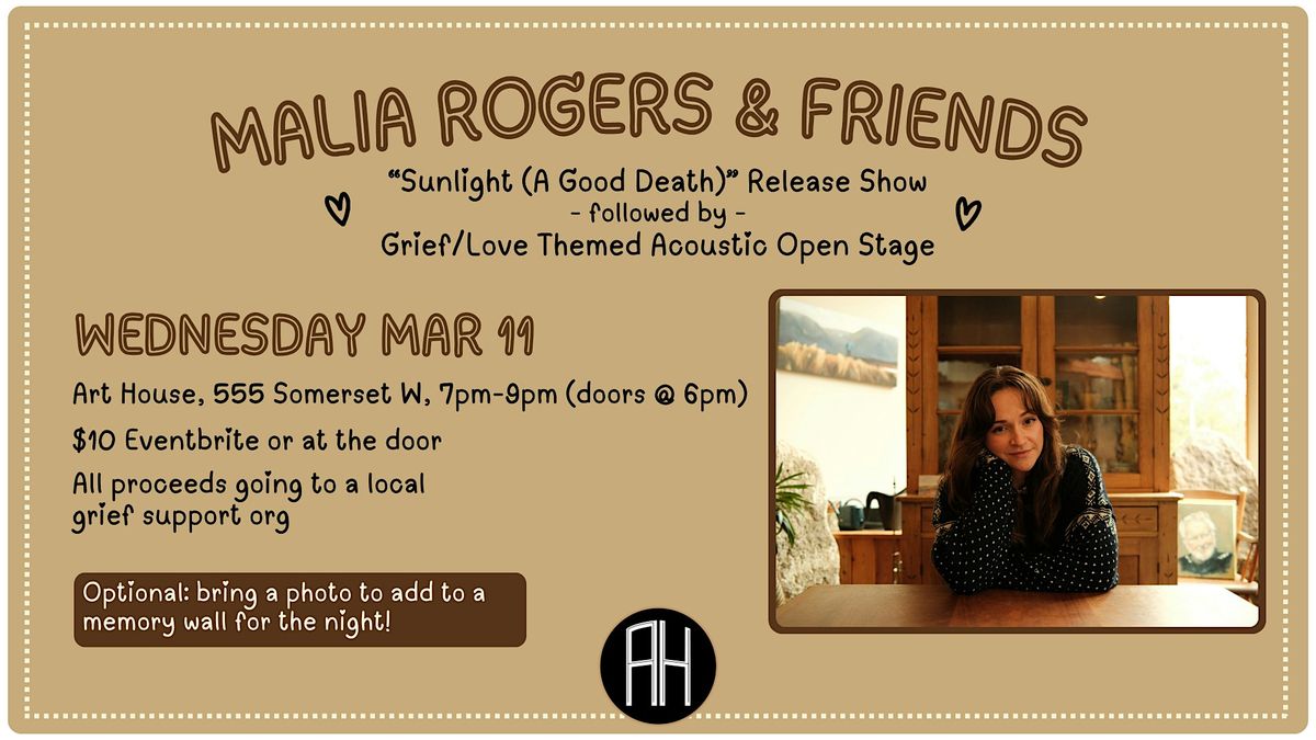 Join us in celebrating the release of singer-songwriter Malia Rogers’ single “Sunlight (A Good Death)” - a folk song about the deep interconnectedness of grief & love. Ticket proceeds will go to a local organization supporting bereaved families and individuals. The night will feature 1 short set from Malia and special guests (TBA) followed by an acoustic open stage for sharing songs & poetry about grief, love, or both. Covers & originals welcome. Optionally, bring a favourite photo to add to a ‘wall of love’ for the night, celebrating the people who shape us.Bios