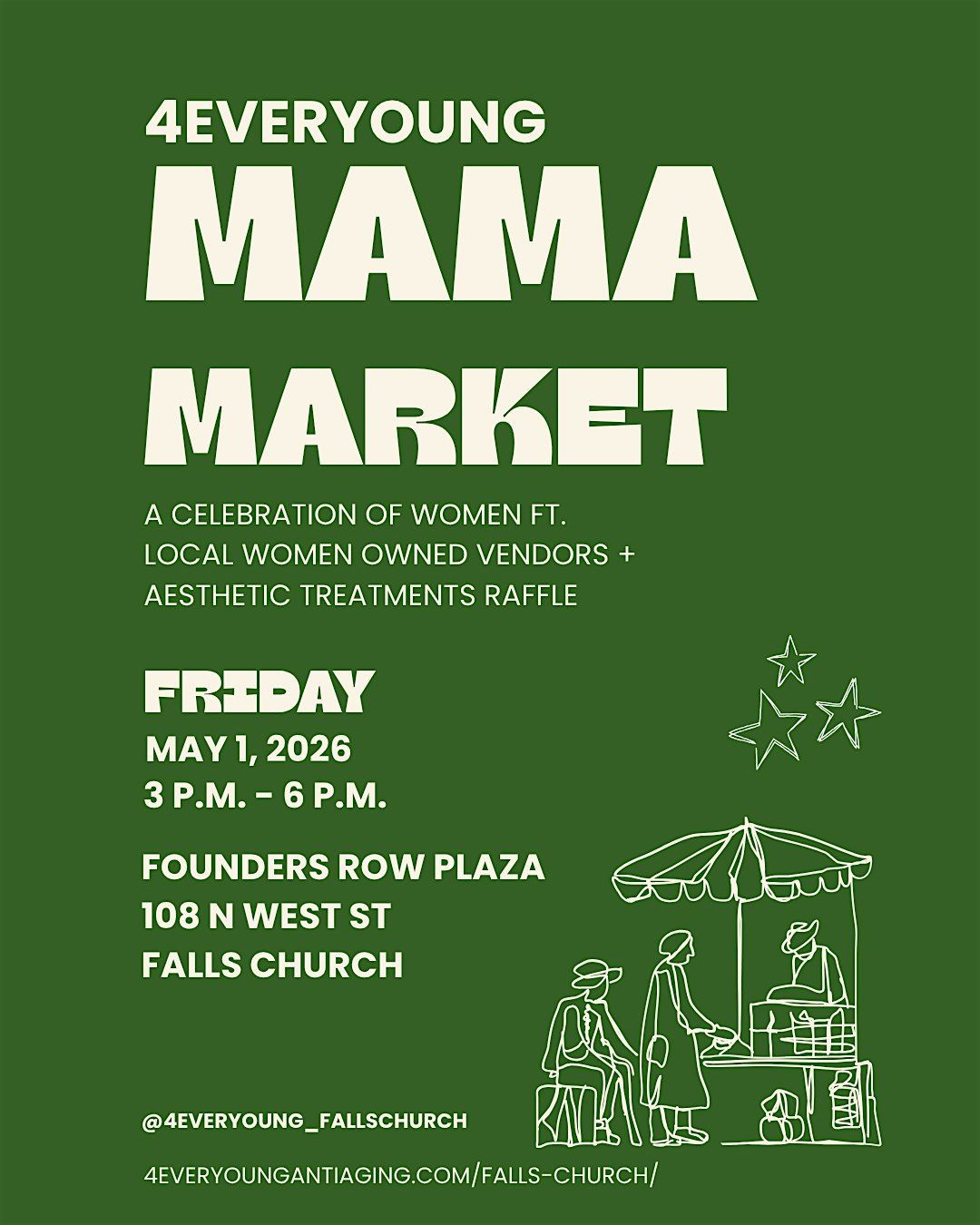 Celebrate Mother’s Day early with 4EverYoung Falls Church at our Mama Market on Friday, May 1 @ 3–6 PM at Founder’s Row Plaza: 108 N West St, Falls Church 💐✨ Join us for an afternoon with refreshments by Ellie Bird, a DIY floral bouquet bar, and more! Enjoy exclusive event-only promotions -perfect for Mother’s Day gifting 🎁 Enter to win incredible raffle prizes like a full facial balancing treatment ($2000+ value) 🔥 Our expert providers will be offering complimentary aesthetic consultations. Bring a friend, sip, shop, and treat yourself—you deserve it 💖