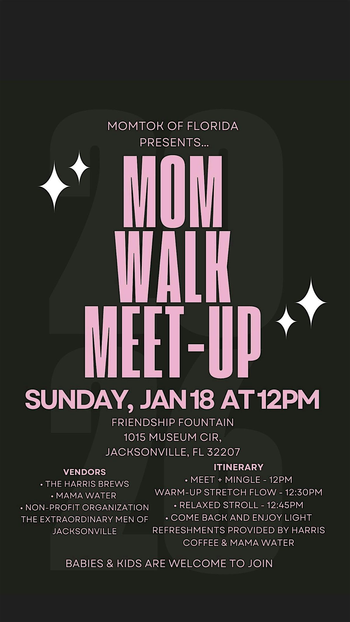Join MomTok of Florida for a welcoming and family-friendly Mom Walk Meet-Up at Friendship Fountain in Jacksonville on January 18th at 12pm. Enjoy a meet-and-mingle, a gentle warm-up stretch, and a relaxed group stroll perfect for moms of all stages. After the walk, enjoy light refreshments provided by The Harris Brews coffee and Mama Water.