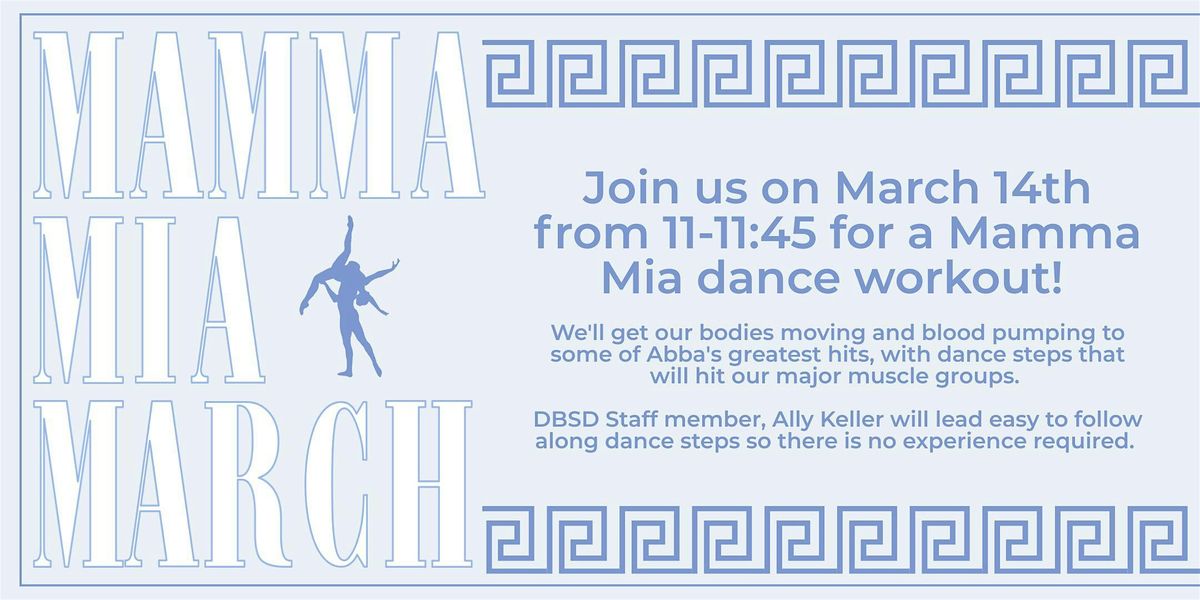 Join us on March 14th from 11-11:45am for a Mamma Mia dance workout! We'll get our bodies moving and blood pumping to some of Abba's greatest hits, with dance steps that will hit our major muscle groups. Miss Ally will lead easy to follow along dance steps so there is no experience required.